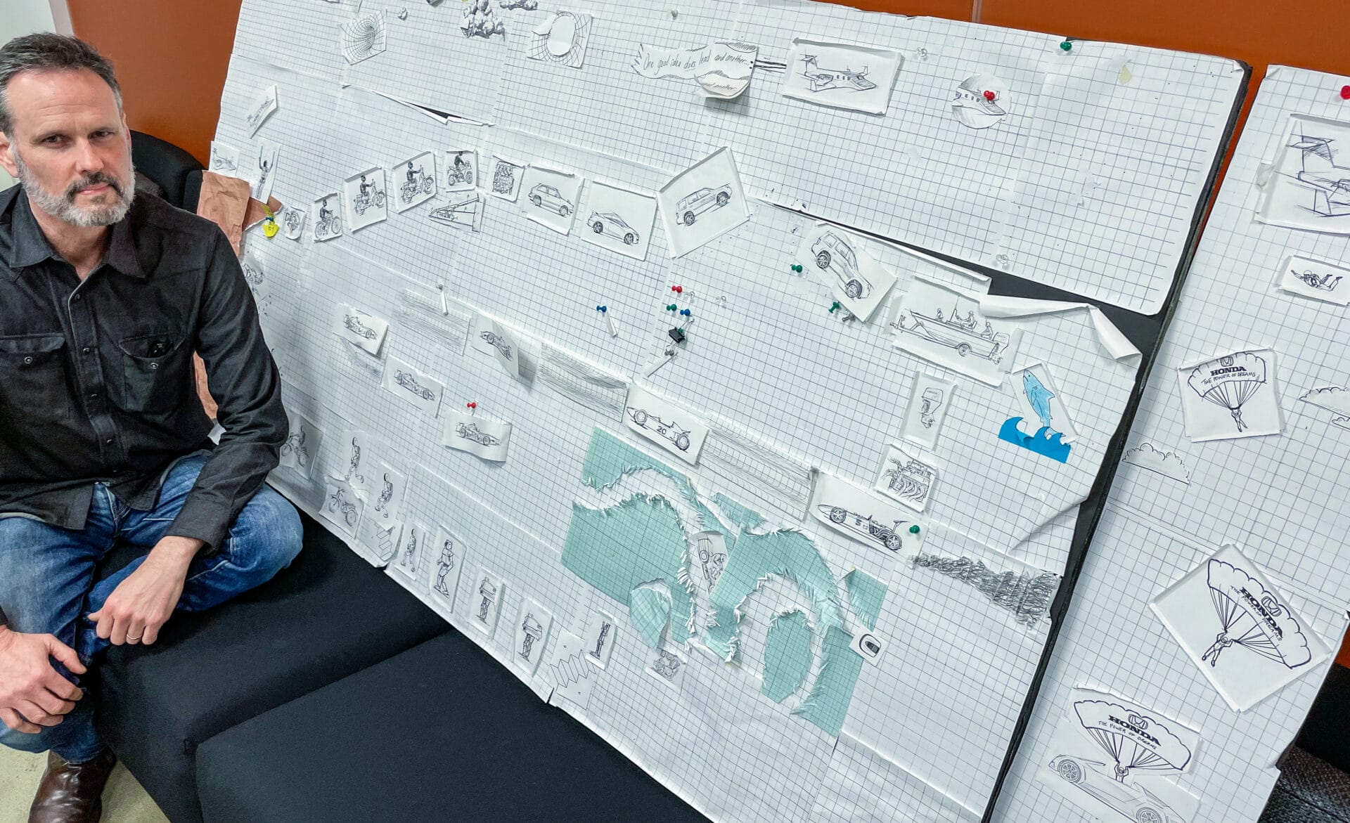 We worked closely with PES for 4 months. We had working meetings with him to figure out the evolving paper textures, drawing styles, and new sequences. It was a blast. From there, PES and his massive crew drew all the illustrations we’d ultimately shoot. The entire journey was laid out on two enormous tables, each with a motion control camera stationed above it to capture each frame, one at a time. We were there with him every shoot day watching the meticulous process the animators went through to bring Honda’s history to life. As the production neared the end of its allotted shoot days there was still a lot of ground to cover. PES and his crew worked round the clock to get the job done. The skill and patience were extraordinary. I’m still in awe of what his team did. As intended, the production was an amazing feat of creative engineering.