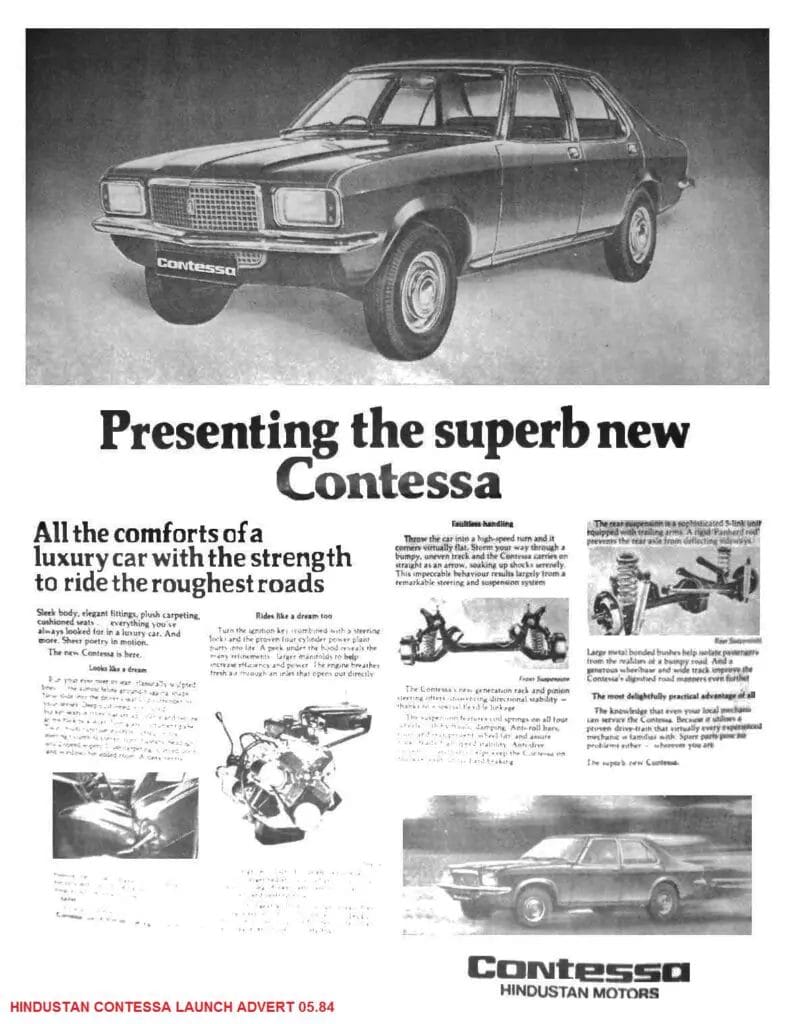 To keep development costs in check, the HM Contessa was introduced to the Indian market with the 50 hp (37 kW) 1.5 L BMC B-Series engine, which also powered the Ambassador in a slightly modified form, along with the Hindustan four-speed gearbox, both from the early 1950s. The Contessa was thus a car introduced in 1984 with a 1970 body and a 1950 engine and gearbox. The press was upbeat about the roomy interior and plush ride but critical of the grossly underpowered engine and equally primitive gearbox. The top speed was only around 125 km/h (78 mph), although there was also a version with higher 8.3:1 compression that offered 54 hp (40 kW).