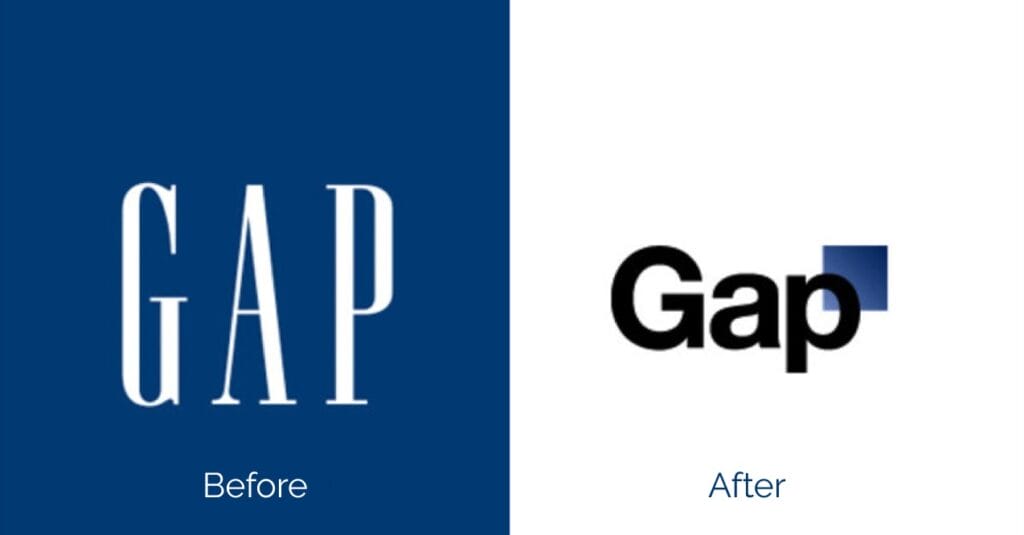 - The Gap. -The denim retailer abandoned its classic monogram in favour of a Helvetica bold nightmare in 2010. When the corporation wanted to go from “classic American” to “modern, sexy, and cool,” it ditched its distinctive stretched typeface in favour of a generic, block letter boring that looked nothing like the old one save for a blue gradient square sticking out of the “p.” Only a week later, the Gap saw it had made a mistake and publicly apologised, saying, “we’ve learned just how much energy there is around our brand, and after much thought, we’ve decided to go back to our iconic blue box logo.”