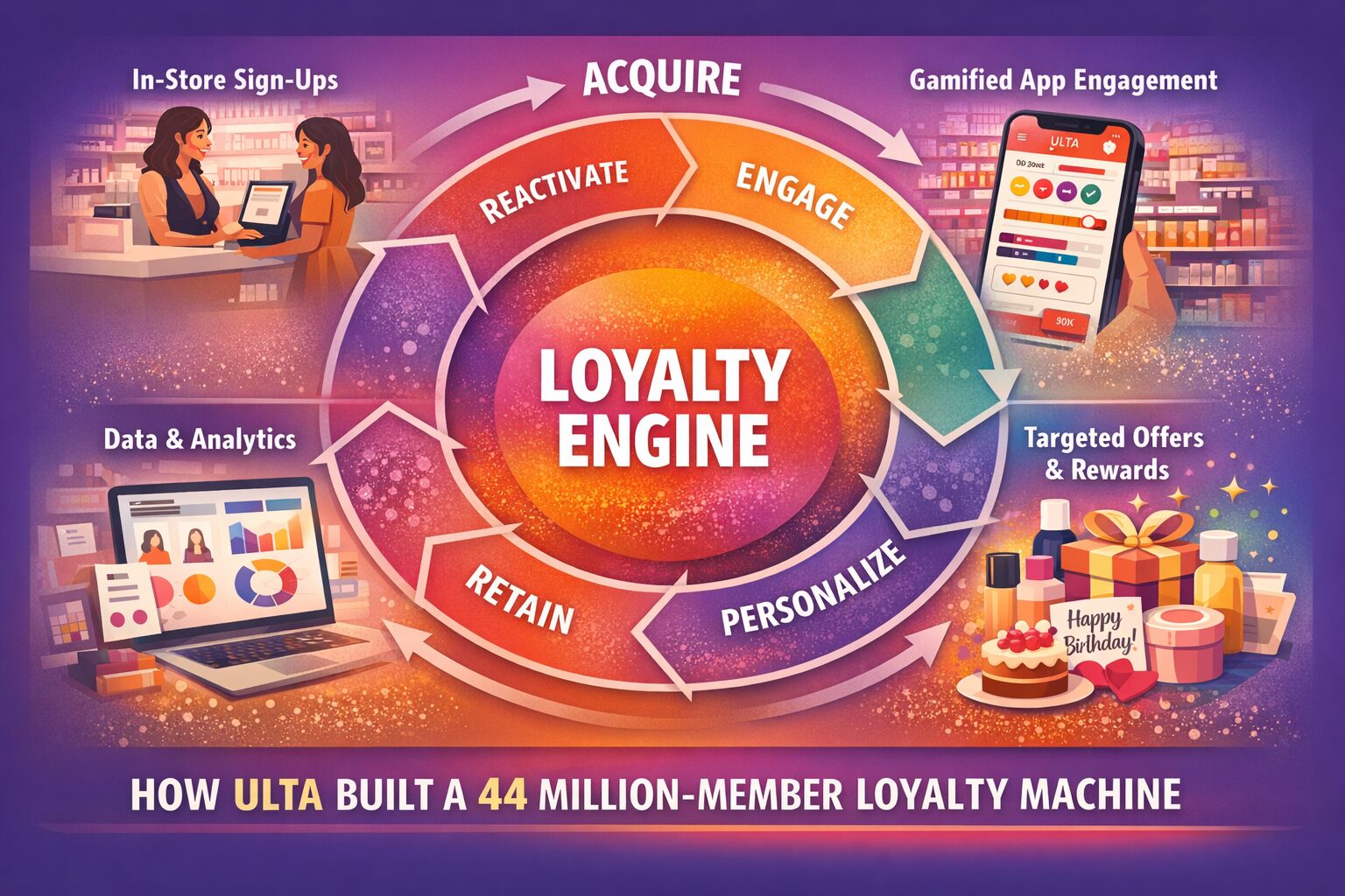 Ulta Beauty’s loyalty programme did not reach 44 million members by offering the biggest discounts or the flashiest app. It grew by designing a system where every element-the points structure, the gamification, the associate training, the app experience, the data infrastructure, the reactivation sequences, the birthday rewards-works together as a single, coherent flywheel.